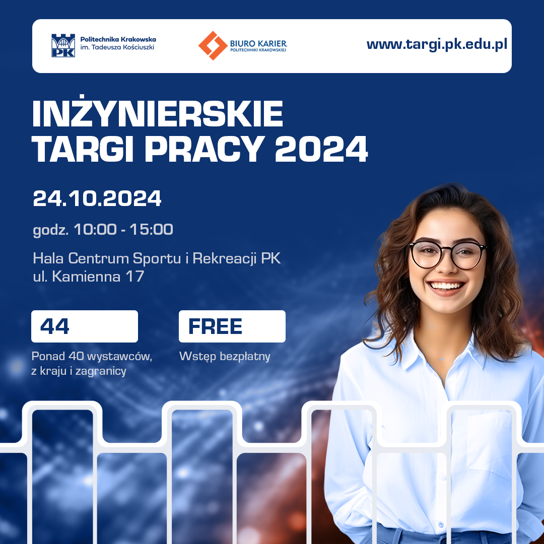 Biuro Karier PK organizuje Inżynierskie Targi Pracy 2024 na naszej uczelni, w dn. 24.10.2024, w godz. 10.00-15.00, w hali sportowej Centrum Sportu i Rekreacji PK, na ul. Kamiennej 17.