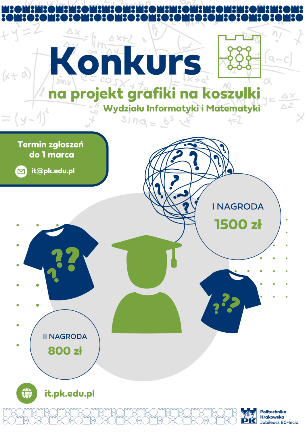 Masz zatem pomysł na unikalną grafikę, która zagości na koszulkach Wydziału Informatyki i Matematyki Politechniki Krakowskiej? To Twoja szansa, by wykazać się kreatywnością i zdobyć atrakcyjne nagrody! 💡✨