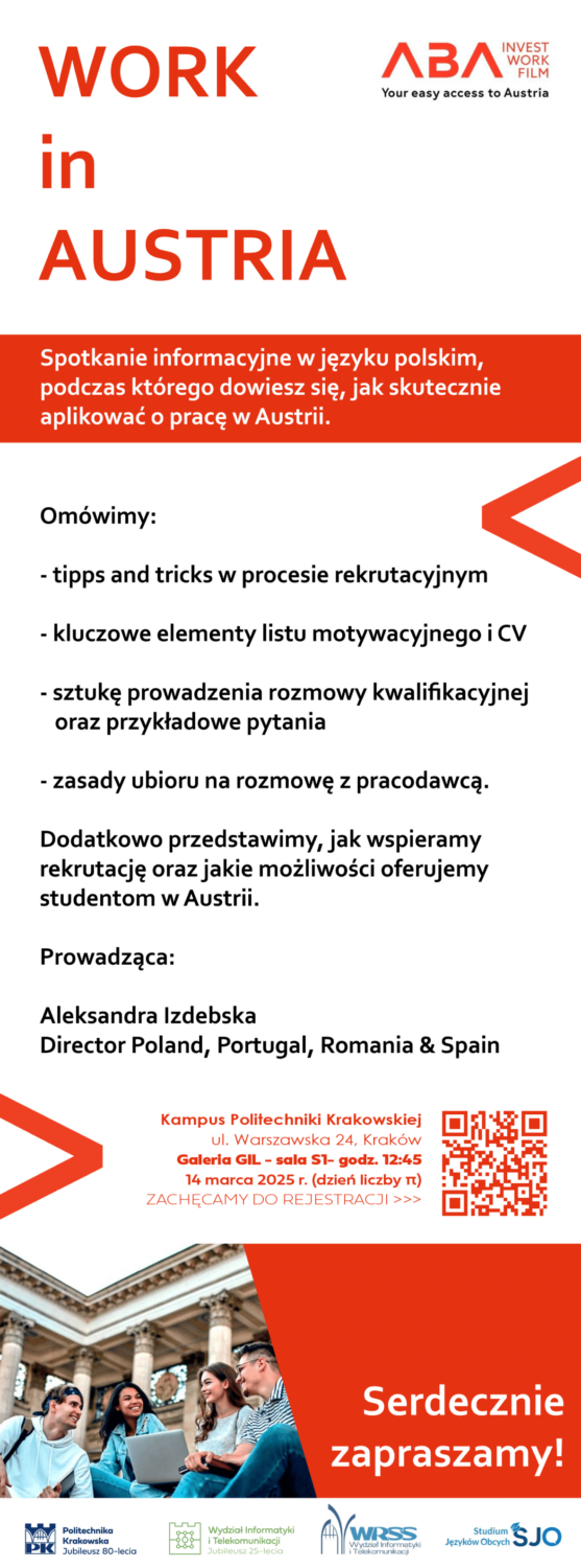 W ramach obchodów dnia liczby π serdecznie zapraszamy na spotkanie informacyjne „Work in Austria”, które odbędzie się już 14 marca 2025 r. (piątek) o godz. 12:45.